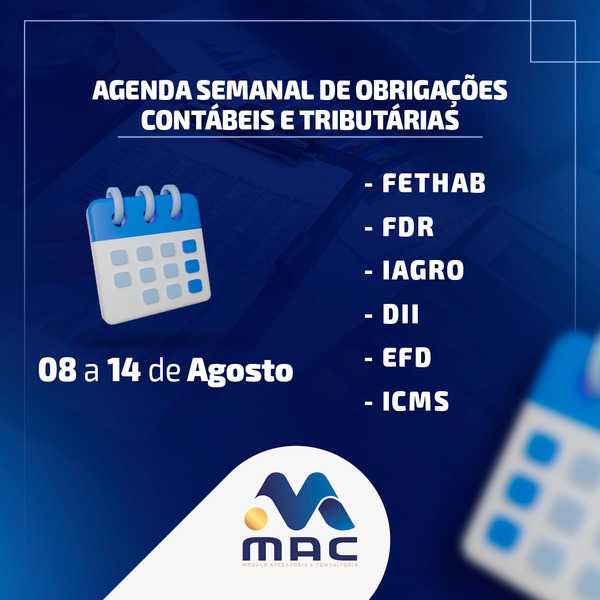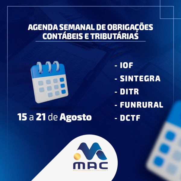 AGENDA SEMANAL DE OBRIGAÇÕES DE 15 A 21 DE AGOSTO